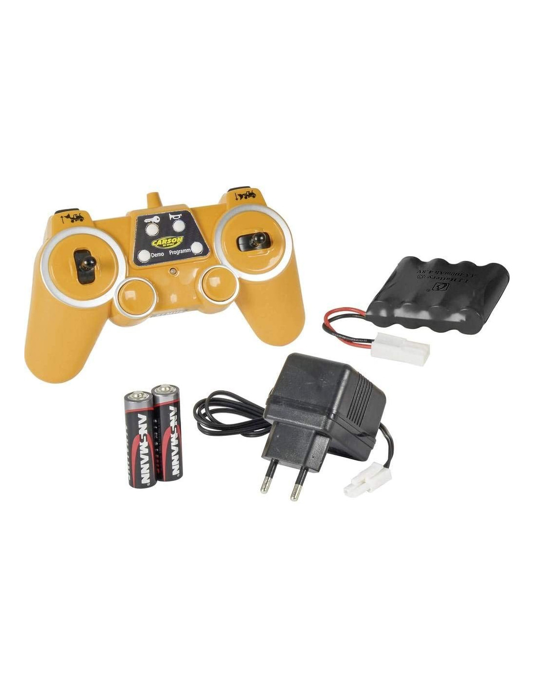 Funciones completas para los constructores jóvenes. La serie RC-BauLine de Carson en escala 1:20 incluye muchos modelos detallados con la última tecnología, como el control remoto multicanal libre de interferencias de 2,4 GHz, sonido y luz, ruido del motor y según la ejecución mediante la función de pulverización de agua controlable mediante el transmisor. Cada modelo tiene un modo de demostración y muestra todas las funciones con solo pulsar un botón en el transmisor y está amortiguado según el modelo y tiene 2 ejes traseros accionados. Toda la serie está completamente equipada con transmisores, baterías, cargador e instrucciones (idioma español no garantizado) y lista para usar después de la carga. Comprar, cargar y conducir. Contenido del envío: modelo listo para conducir, control remoto de 2,4 GHz, emisoras, baterías, cargador de enchufe e instrucciones de seguridad: no apto para niños menores de 14 años. El paquete debe conservarse ya que contiene información importante. Las imágenes pueden diferir del producto en el paquete. Carson se reserva el derecho a realizar mejoras y cambios en cualquier momento. Detalles técnicos: secuencia de arranque con pitido, sonido del motor, bocina, funciones completas con sonido del motor, pala excavadora totalmente funcional con sonido, función de demostración.