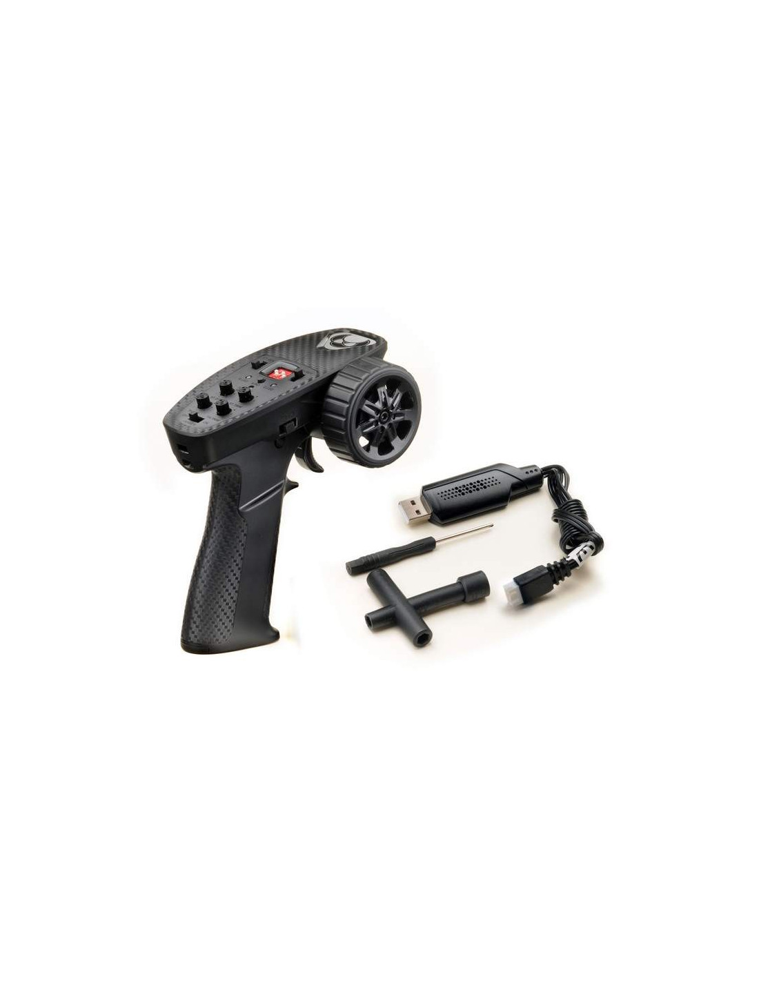 El vehículo está alimentado por una unidad de controlador/receptor de velocidad 2 en 1 resistente al agua (PPX4) y una batería LiPo de 7,4 V con 600 mAh, lo que garantiza un tiempo de conducción de hasta 60 minutos. Cargamos la batería con un cable de carga USB. El tiempo de carga es de aproximadamente 45 minutos.