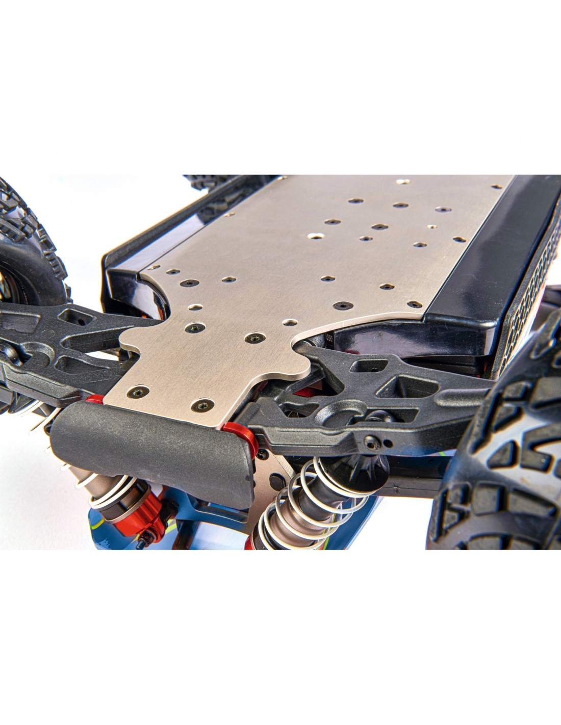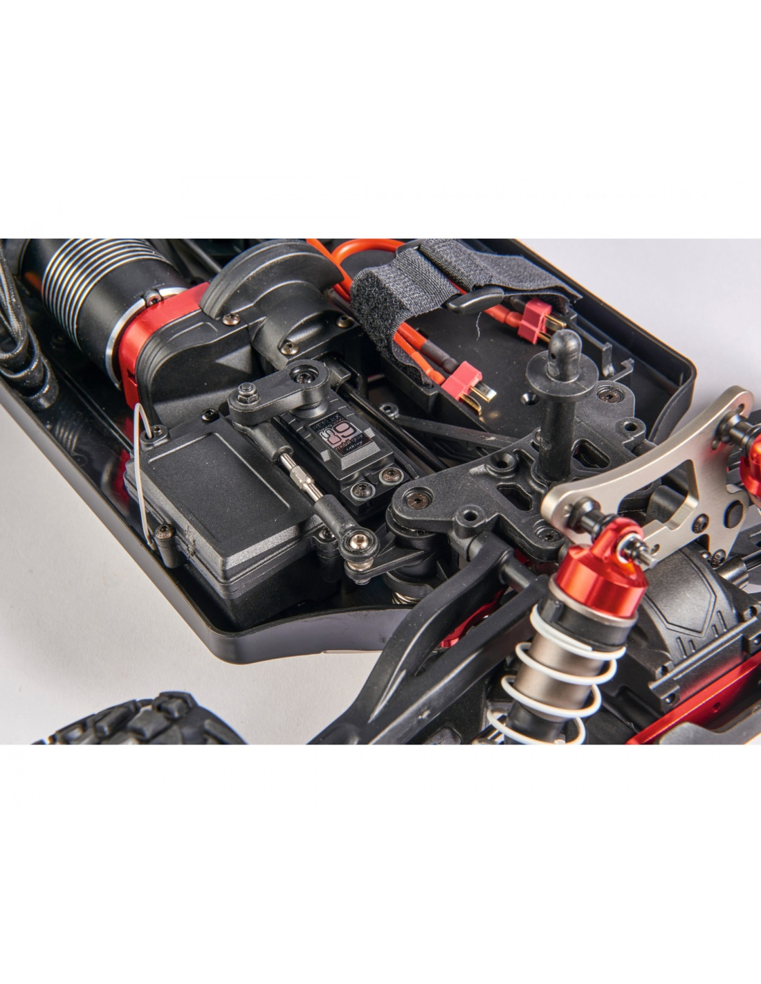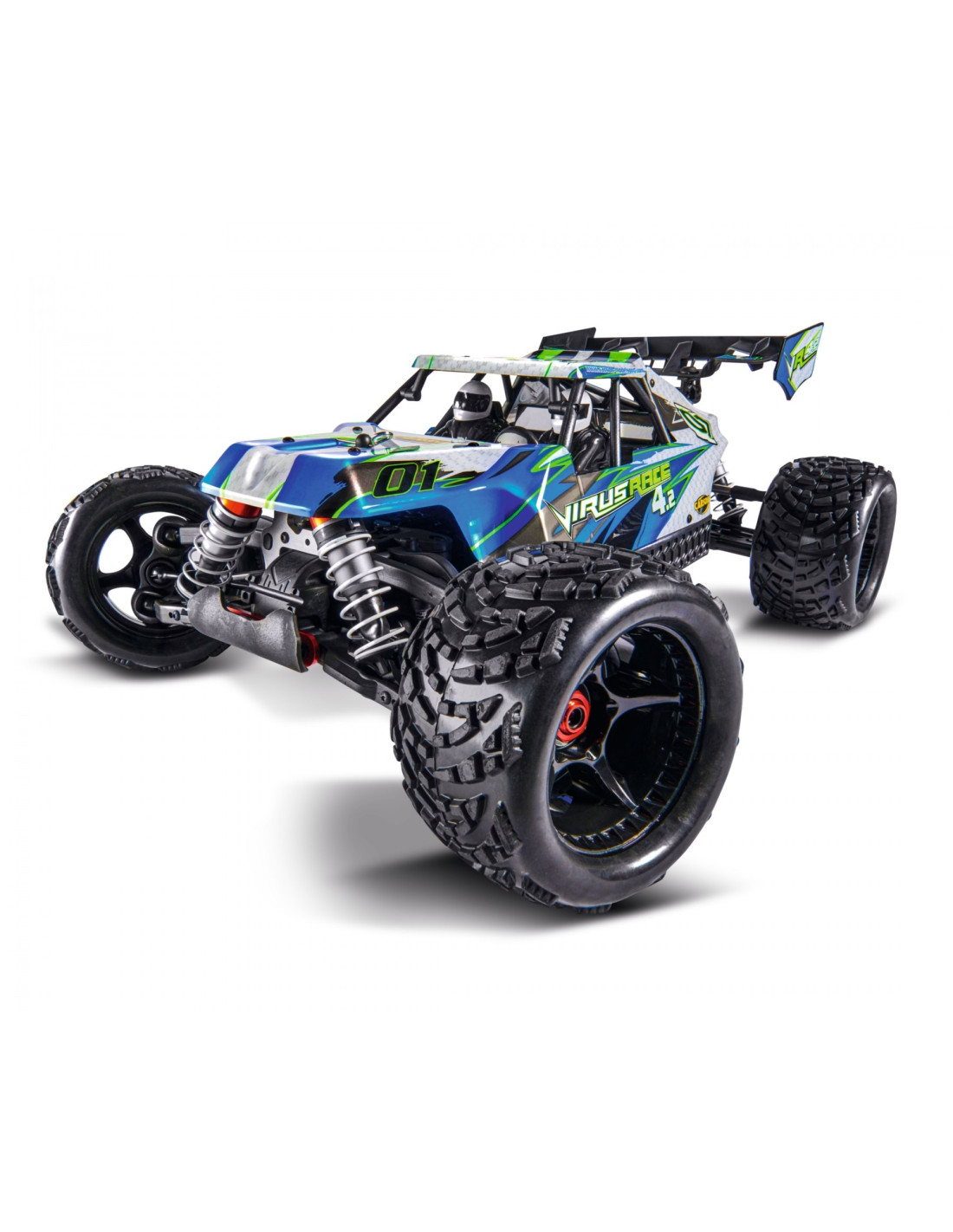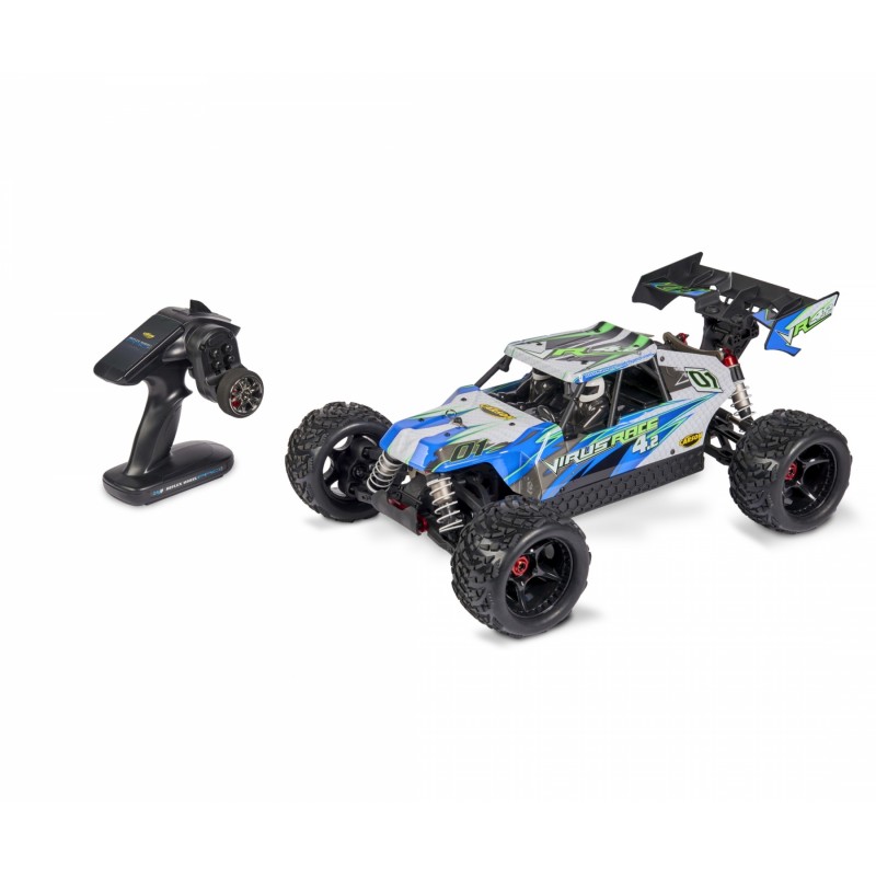 El Virus Race 4.2 4S Brushless RTR con su chasis de carrera optimizado y su potente transmisión sin escobillas está hecho para pendientes todoterreno polvorientas. Para proteger el servo de dirección de la humedad, se ha sellado el chasis de aluminio extra estrecho de 3 mm. Los sólidos brazos oscilantes y los deflectores de suciedad circunferenciales garantizan una robustez adicional. El motor sin escobillas HOBBYWING de 2100 kV proporciona una enorme potencia a la tracción total y catapulta al 4.2 a velocidades máximas de hasta 80 km/h. Los amortiguadores de presión de aceite de aluminio Big Bore y un centro de gravedad extra bajo garantizan un agarre perfecto al suelo. La versión RTR del enérgico buggy de carreras viene con un sistema de control remoto RC de 2,4 GHz e instrucciones detalladas. Compra – Carga – ¡Acción!