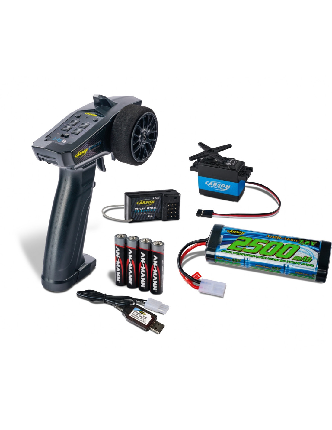transmisor de 3 canales de 2,4 GHz, receptor de 3 canales, cargador USB, batería de conducción de 7,2 V / 2500 mAh, servo de dirección CS-3, 4 pilas de transmisor AAA y manual