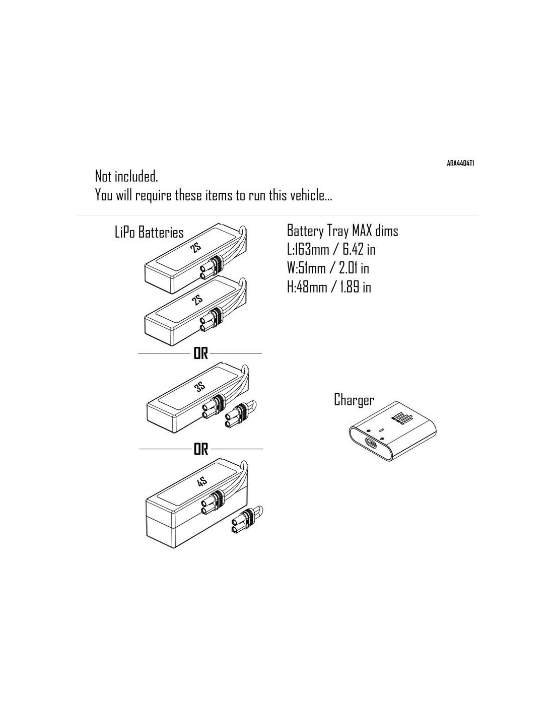 Una batería LiPo y un cargador es todo lo que necesitará para completar el ARRMA MOJAVE 4S BLX 4X4 a escala 1/8. ¡Coloca un paquete cargado y prepárate para la explosión ARRMA amplificada y todoterreno, al estilo de un camión del desierto!