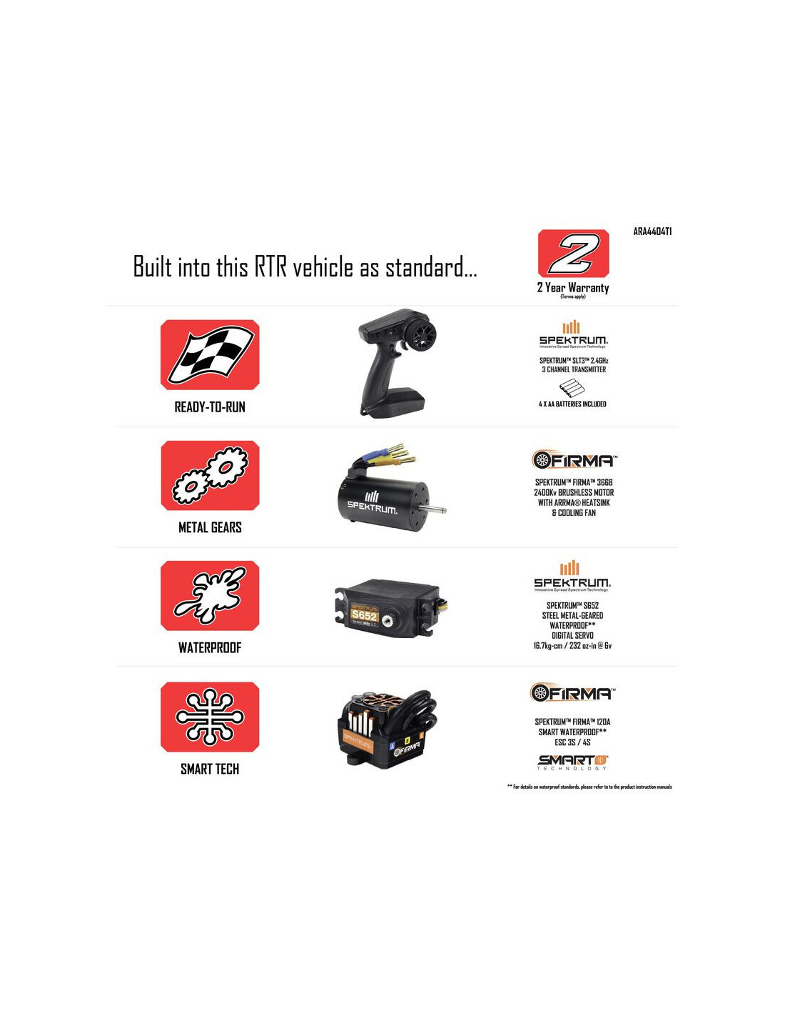 Las capacidades de velocidad máxima superan las 50+ MPH en condiciones óptimas, pero si es un conductor nuevo, simplemente configure los límites de aceleración de la radio Spektrum SLT3 de 3 canales al 50% o 75% hasta que esté listo para manejarlo todo. El receptor Spektrum SR315 es de protocolo dual. Si actualiza a un transmisor Spektrum DSMR®, puede descargar la aplicación gratuita Spektrum Dashboard para su dispositivo móvil y aprovechar al máximo las capacidades de telemetría inteligente que ya están presentes en la electrónica de Firma. Obtenga actualizaciones en tiempo real de la temperatura del ESC, el voltaje del receptor (BEC), el voltaje del paquete de transmisión y las RPM del motor.
