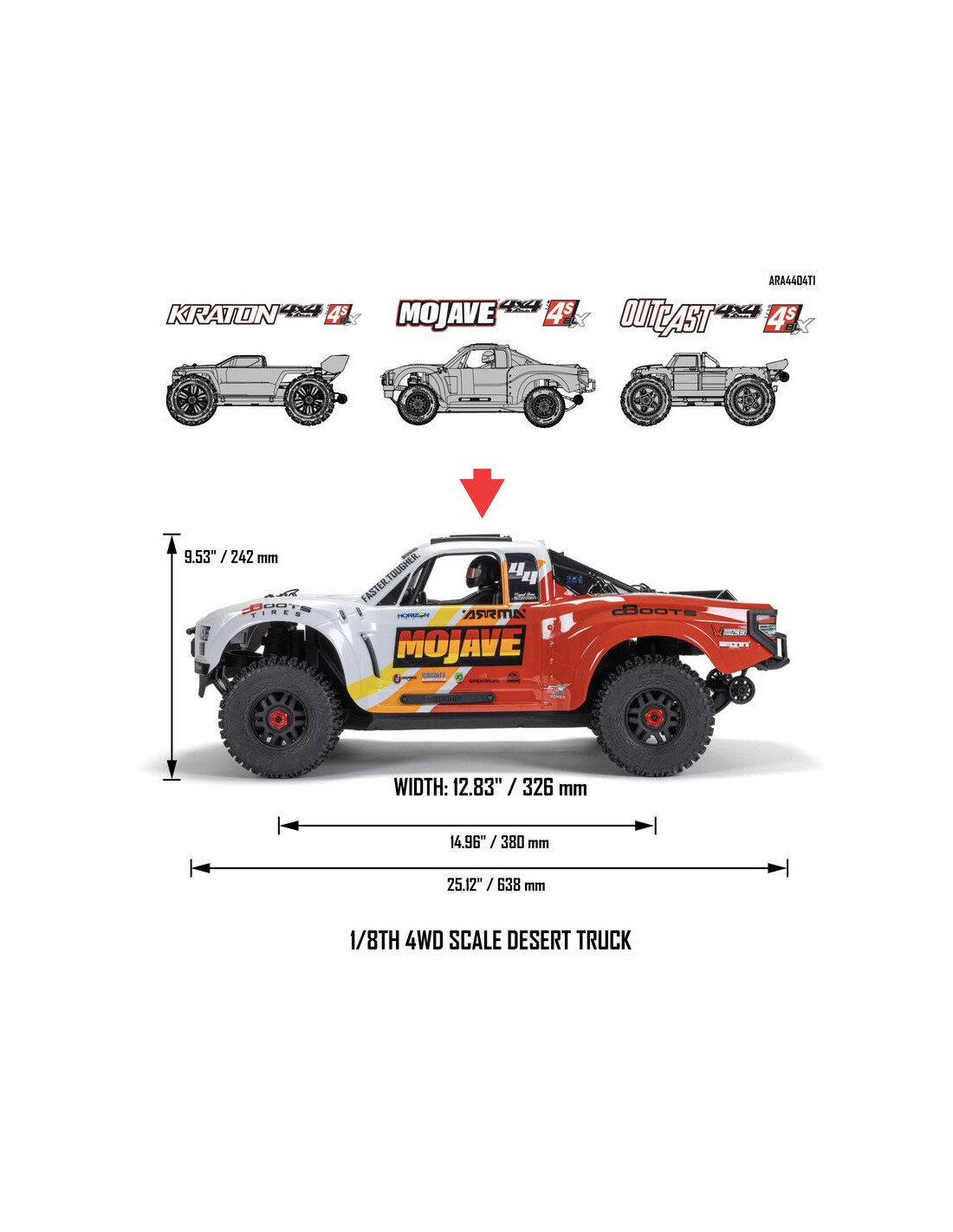 Entre los ágiles atacantes 3S y las enormes máquinas 6S, surge la plataforma con los beneficios de ambos: el ARRMA® 4S BLX. Consíguelo al estilo de una camioneta del desierto con el MOJAVE™ 4S BLX 4X4 RTR a escala 1/8, que presenta la legendaria dureza ARRMA más la potencia sin escobillas Spektrum™.