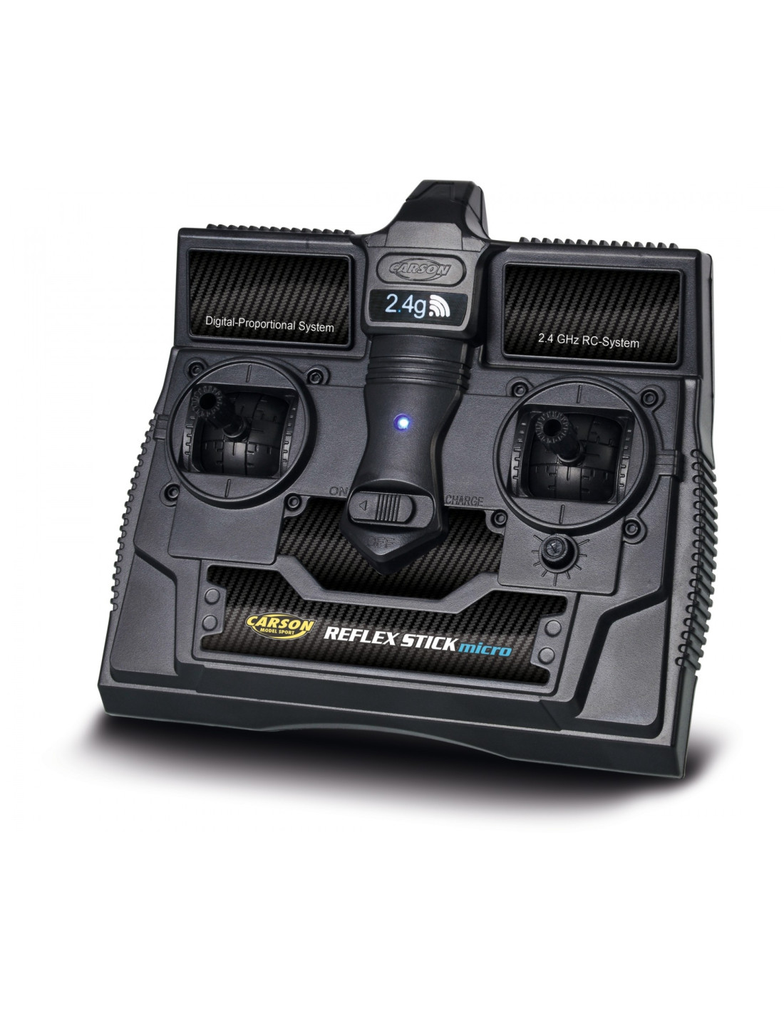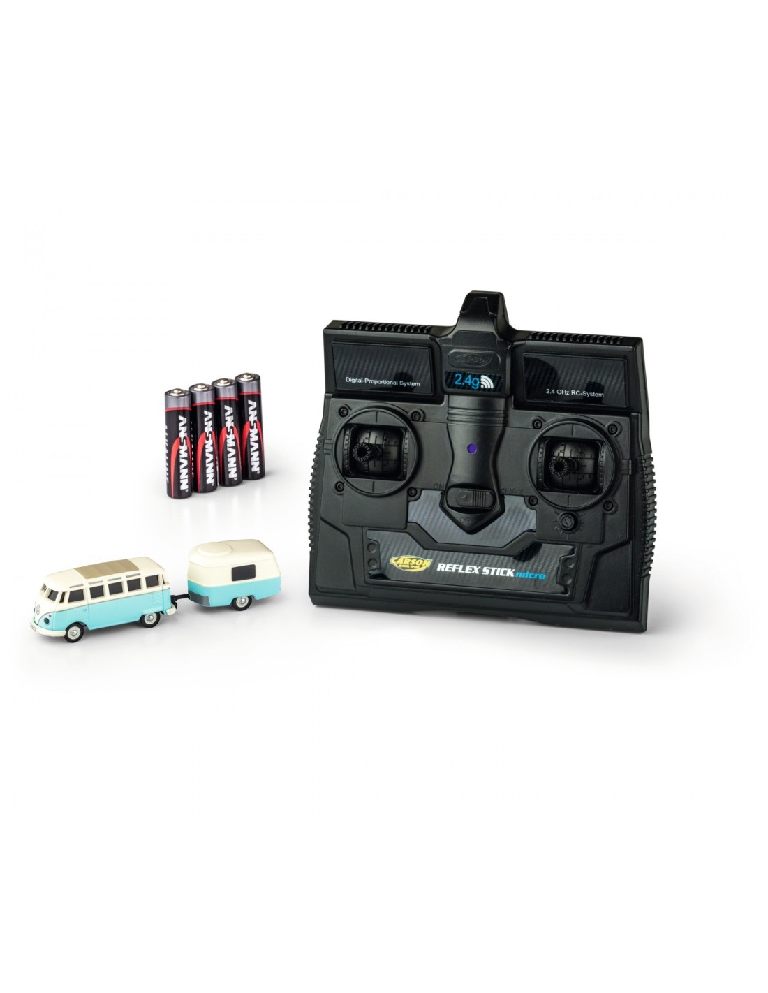 Las luces traseras y de conducción en funcionamiento completan la poderosa impresión de este pequeño clásico, mientras que el control remoto "Reflex Stick Micro", de diseño técnico, une perfectamente la nostalgia y los tiempos modernos. El vehículo y el remitente se almacenan en una vitrina suministrada. 4 baterías de remitente AAA completan el volumen de suministro para crear un juego completamente completo. Esperamos que te diviertas mucho con el nuevo VW T1 Samba de CARSON.