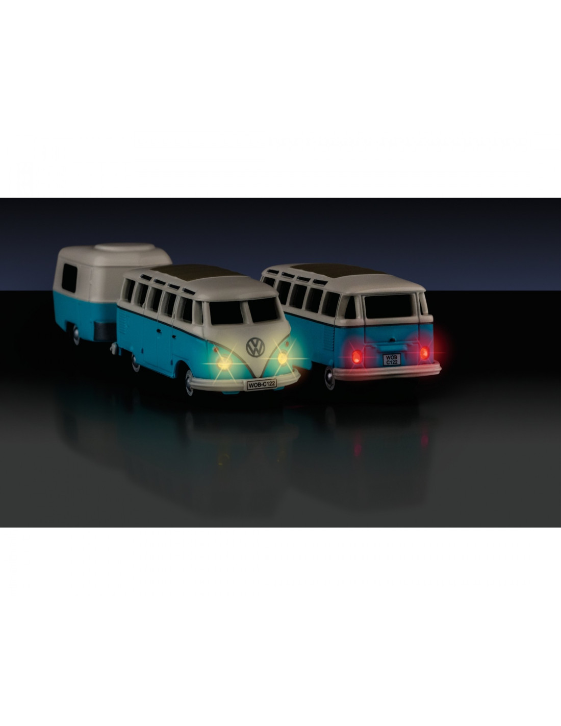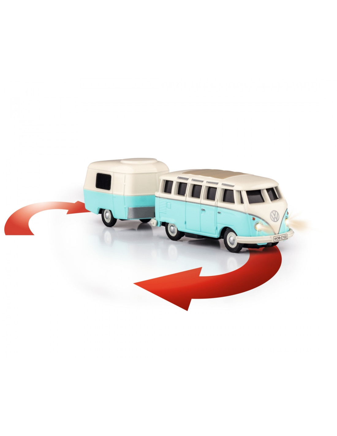 Por lo tanto, la combinación icónica de minibús y remolque (escala 1:87) presenta un sistema RC de 2.4 GHz sin interferencias que permite una aceleración y un control de la dirección proporcional digitalmente sintonizado con precisión con ajuste de dirección. La batería de litio incorporada permite un tiempo de conducción de hasta 35 minutos, mientras que la carga solo llevará 30 minutos y se puede realizar a través del enchufe de alimentación conectado directamente al transmisor. De esta manera, la pequeña Samba siempre está lista para comenzar, incluso cuando está fuera de casa. Gracias a su círculo de giro muy pequeño, el nostálgico vehículo es adecuado para su uso no solo en un escritorio, sino también en una instalación de tren en miniatura donde puede dar vida a las calles junto a las vías. La pintura y la impresión detalladas, así como