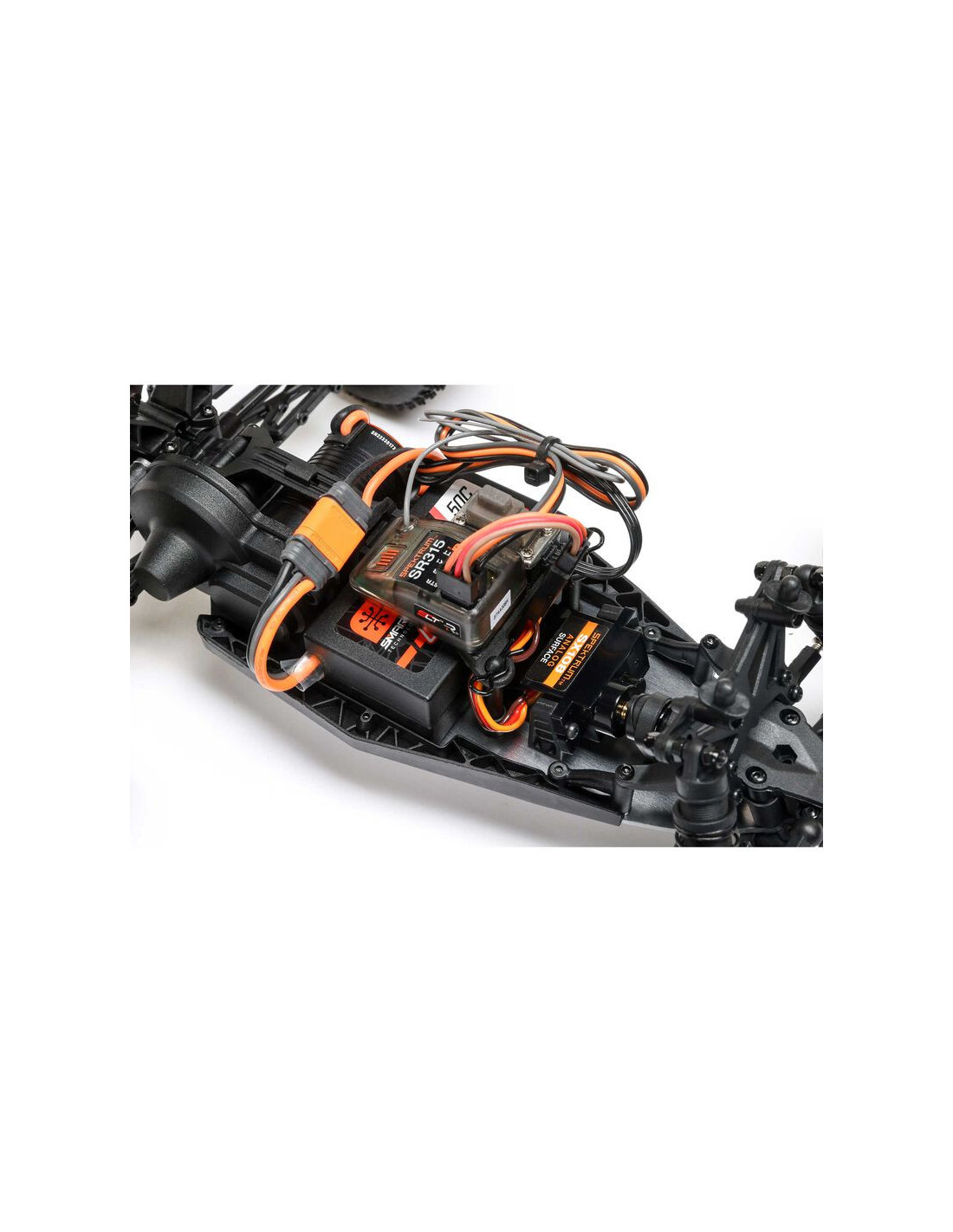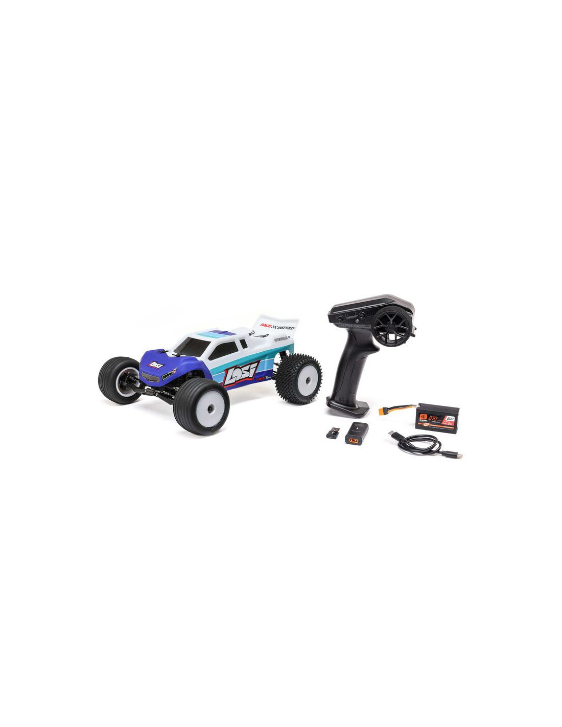 Una batería LiPo Spektrum™ Smart 810mAh 2S de alta capacidad proporciona tiempos de funcionamiento prolongados. Está emparejado con un cargador Smart USB-C fácil de usar para una carga segura y precisa. El paquete RTR también incluye un transmisor Spektrum SLT2™ de 2,4 GHz con muchas funciones útiles para los nuevos corredores. La limitación del acelerador, por ejemplo, permite a los principiantes limitar la velocidad máxima al 50 % o 75 % del potencial total del camión para que puedan aprender habilidades de carreras RC de forma gradual y segura.