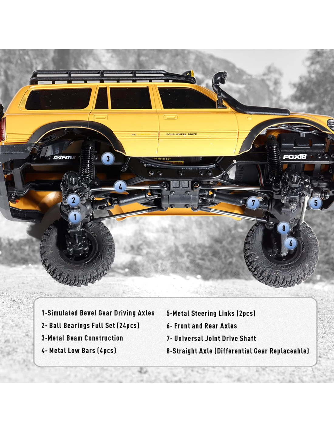 La nueva plataforma FCX18 lleva el rendimiento a escala 1/18 al siguiente nivel con nuevos amortiguadores llenos de aceite, ejes de portal y una transmisión de 2 velocidades para un rendimiento superior.