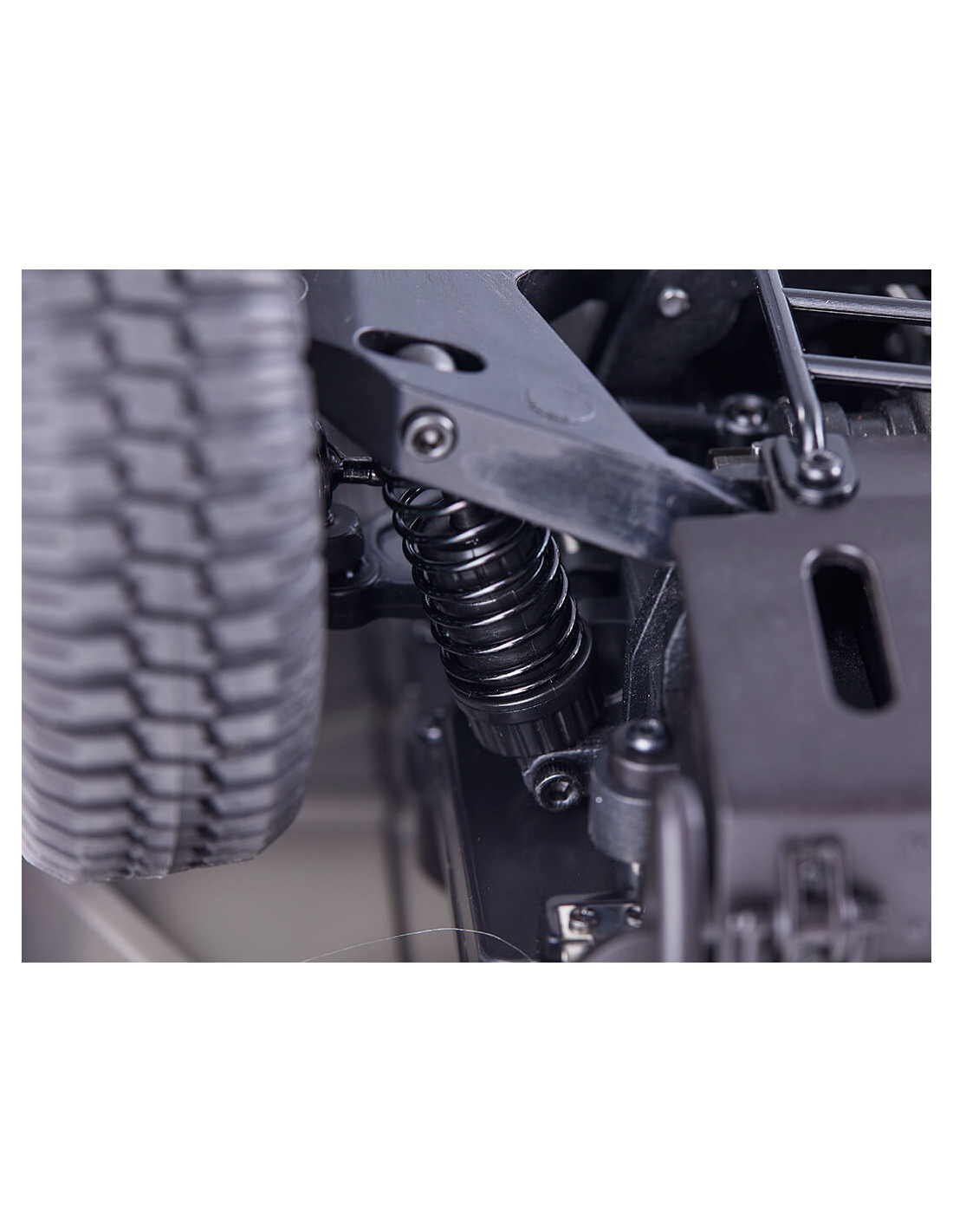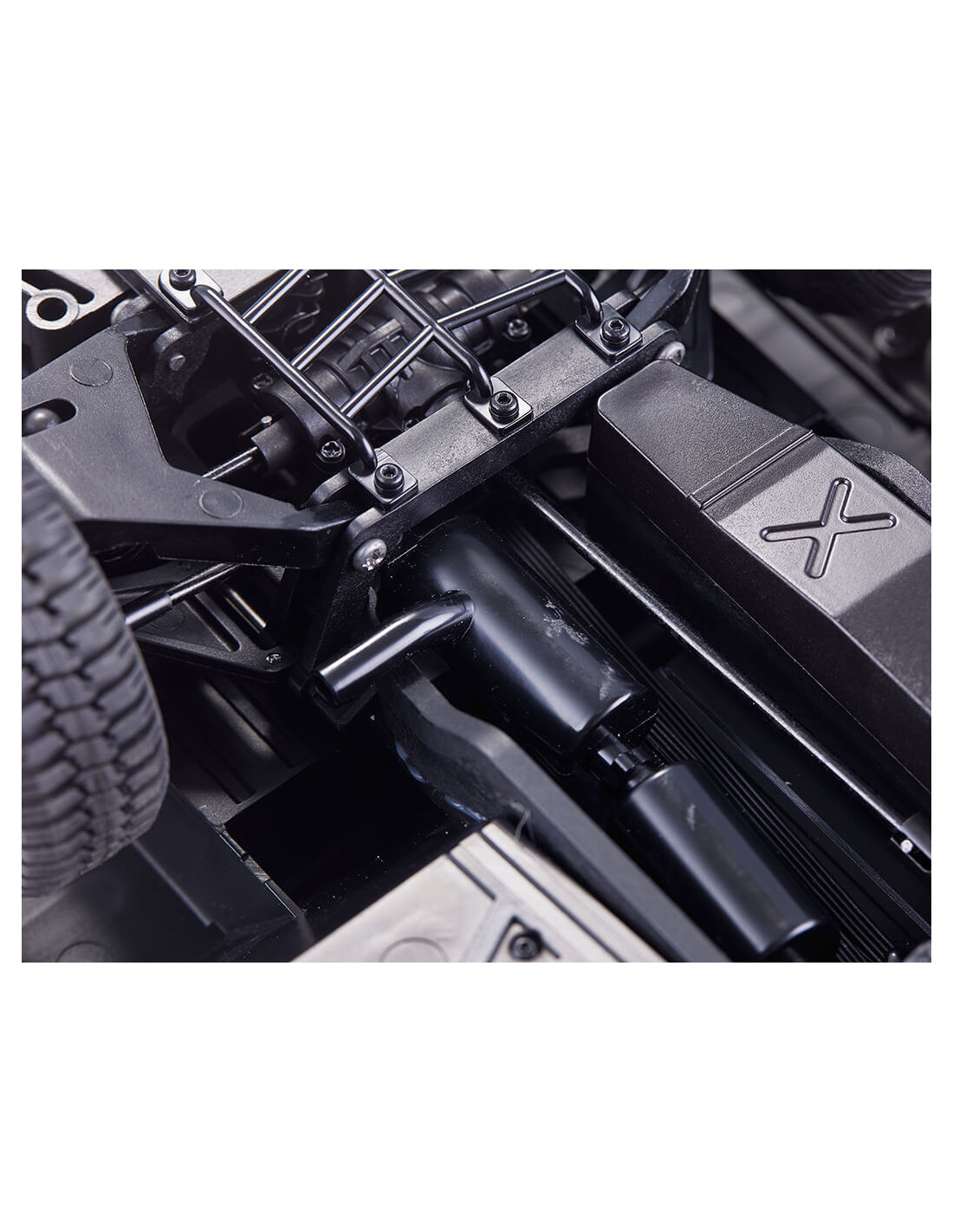 Un sistema de radio proporcional digital de 2,4 G y 7 canales, una unidad tres en uno de receptor/ESC/control de luces, 7 servos (incluido 2 servos de engranaje metálico de 13 g) a cargo de la dirección de las ruedas delanteras y traseras, bloqueos de diferencial de las ruedas delanteras y traseras, cambios de alta y baja velocidad, conmutación de tracción 2/4 ruedas y articulación del volante.