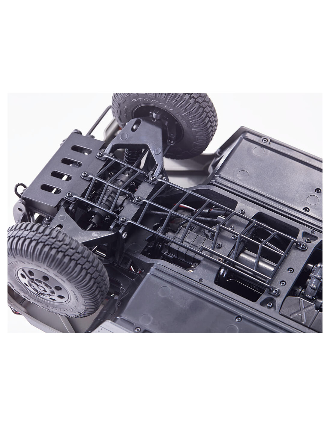 La potencia proviene de un motor 370 oculto dentro de la carcasa del motor a escala. Sin embargo, la caja de cambios no necesita estar oculta, ya que estos conjuntos de engranajes funcionan dentro de la carcasa de la caja de cambios. Dos servos están ubicados a cada lado del motor y controlan respectivamente tanto el cambio entre marchas de alta y baja velocidad como el funcionamiento de la caja de transferencia, cambiando así entre tracción trasera y tracción a las cuatro ruedas. La potencia de la caja de transferencia se transmite a los ejes delantero y trasero a través de un par de ejes de transmisión de metal. Tanto el diferencial delantero como el trasero también tienen una función de bloqueo del diferencial, cada uno impulsado por un servo que se puede bloquear por control remoto. Cuatro ejes de transmisión de metal transmiten potencia en cada esquina del vehículo desde el diferencial hasta el conjunto de engranajes de reducción, comúnmente conocido como "eje de portal".