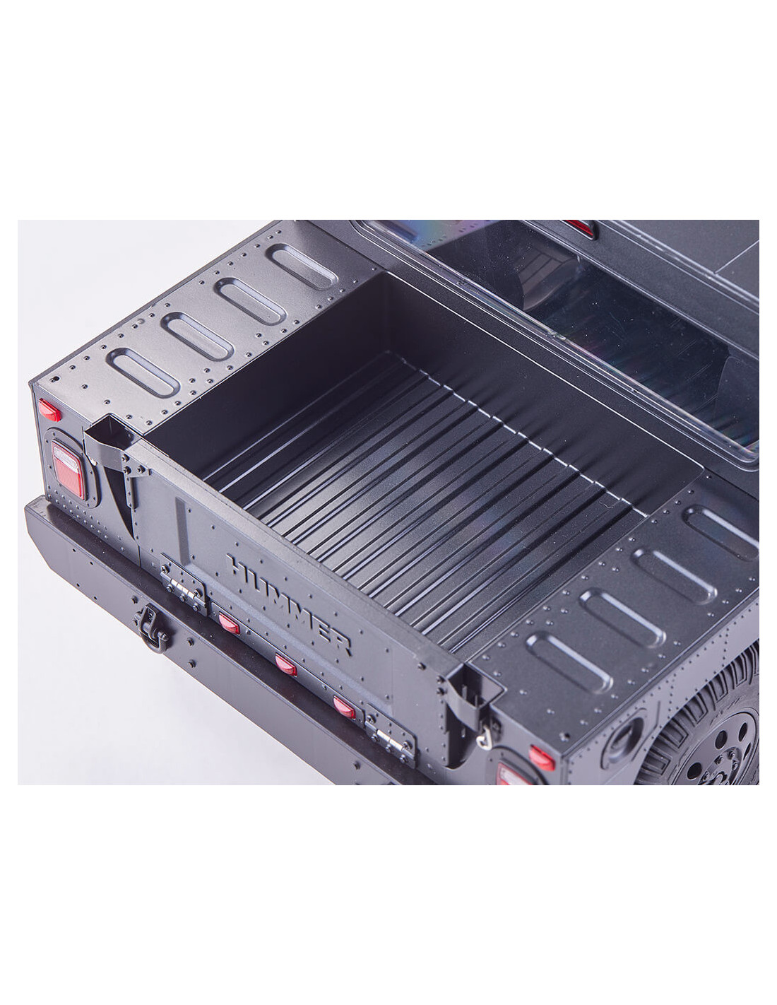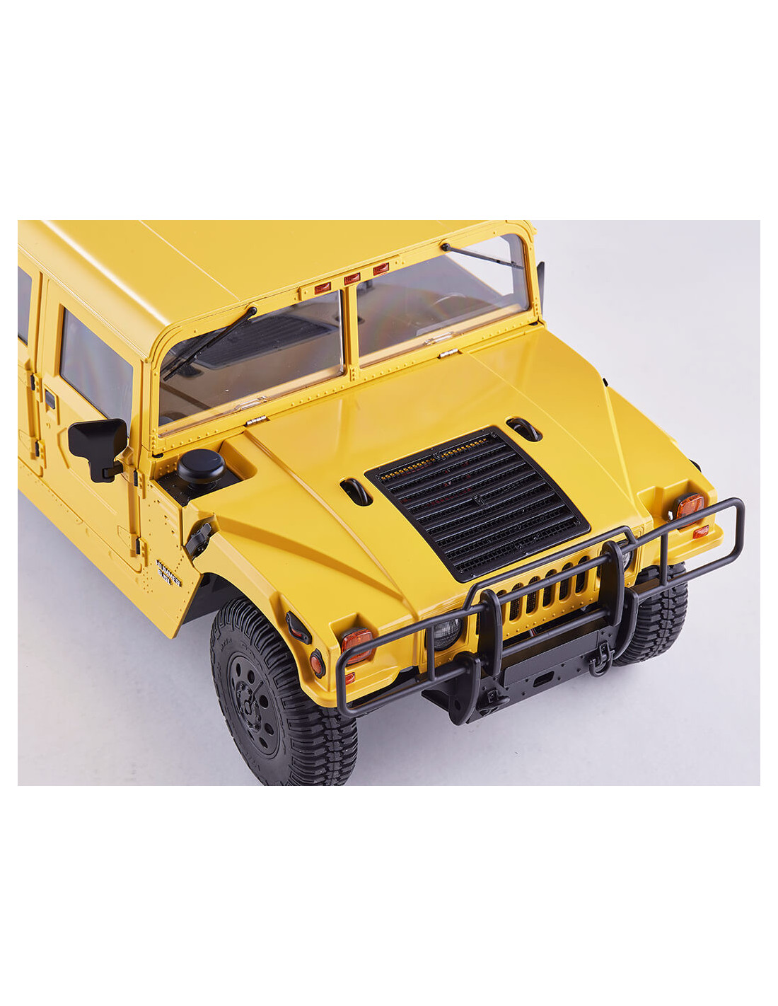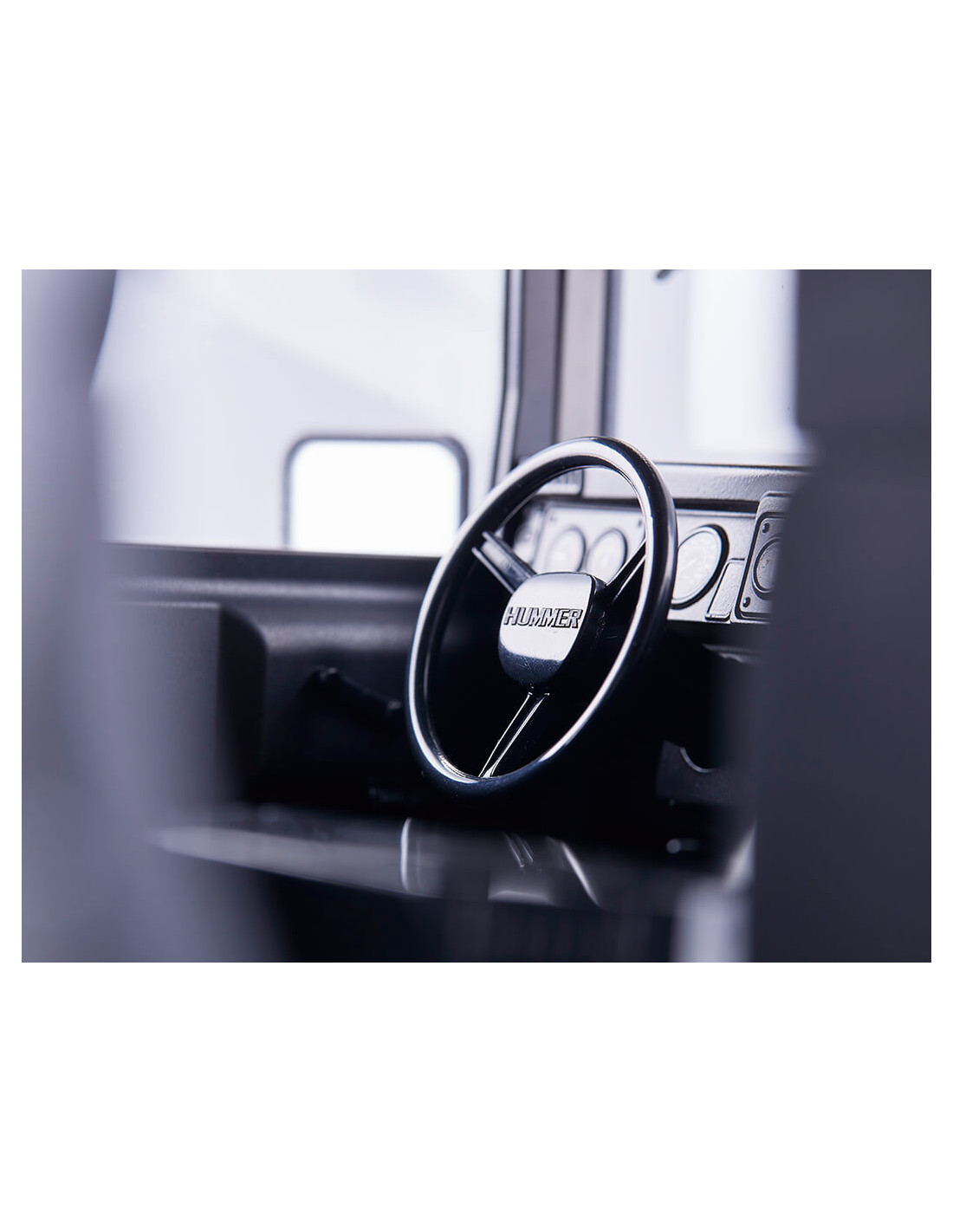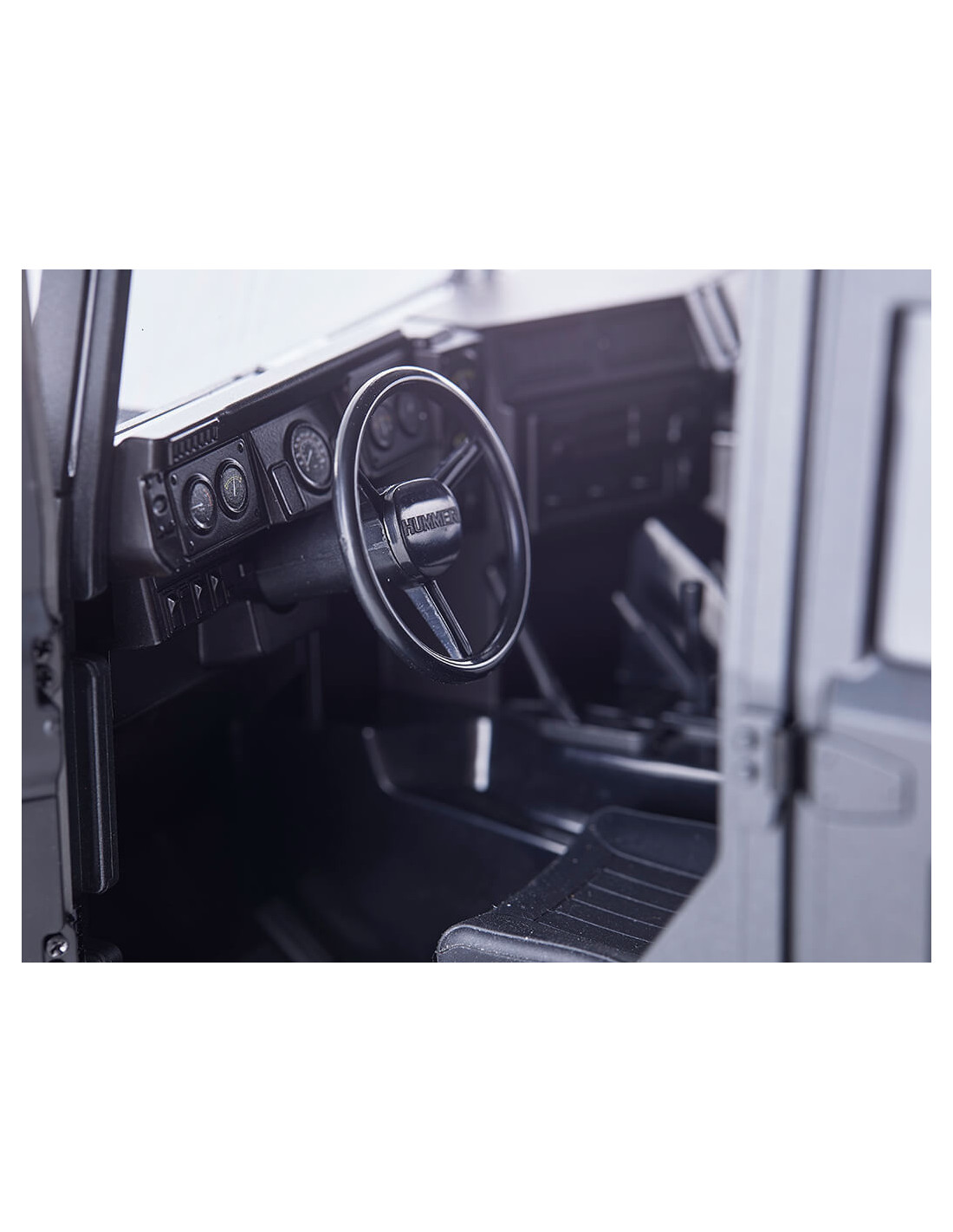 Para satisfacer a los entusiastas de la escala más críticos, tanto en el hobby como en la industria del RC a escala, la atención al detalle de este modelo fue primordial, incluso en el interior, perfectamente recreado. El HUMMER H1 utiliza un diseño de motor central delantero como el vehículo real y, para facilitar el mantenimiento, el capó está diseñado para plegarse hacia adelante. Al plegar el capó hacia arriba, el parachoques delantero también debe plegarse hacia adelante al mismo tiempo para evitar daños.