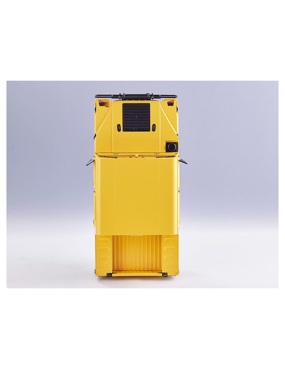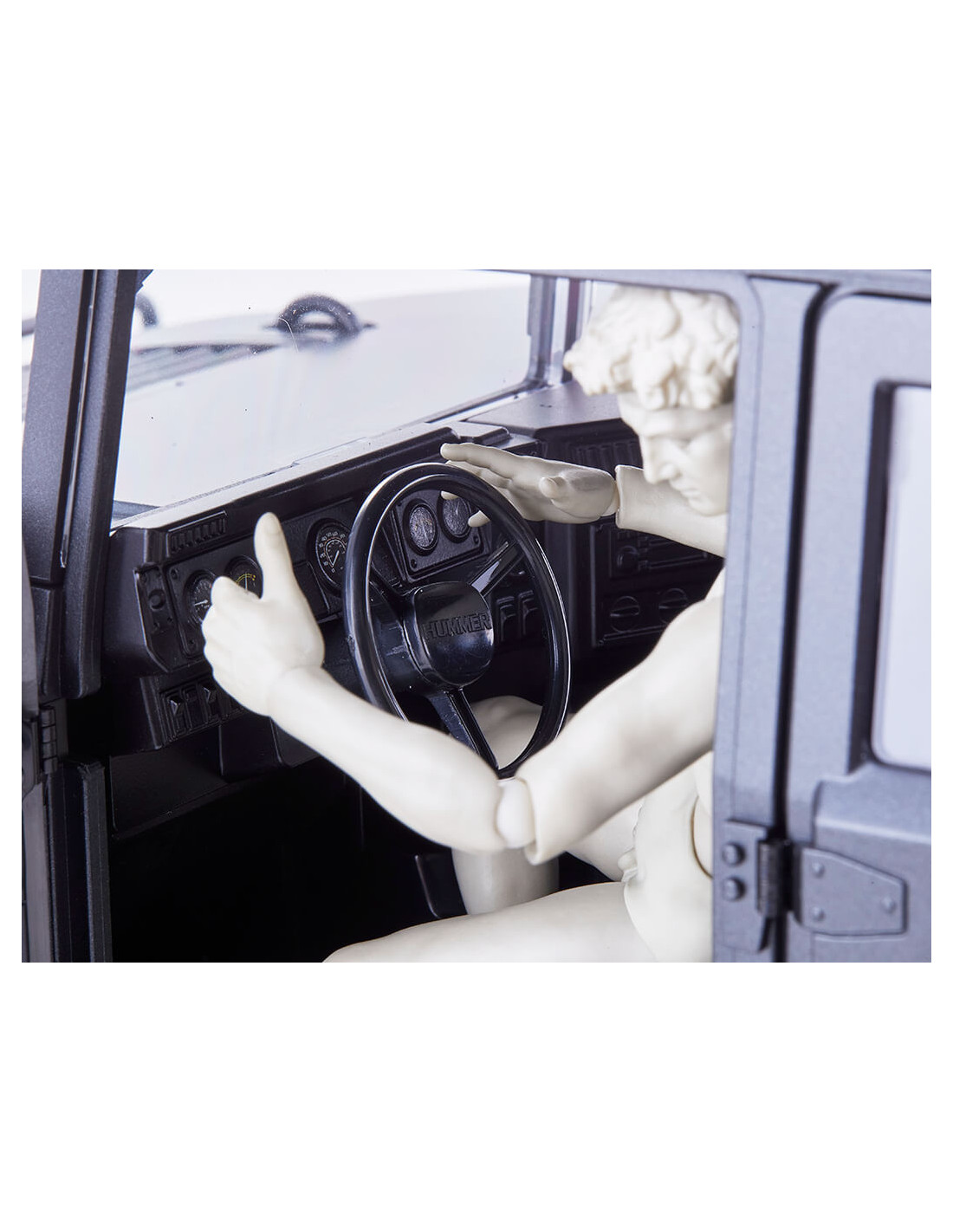 Las 4 puertas del FMS HUMMER H1 se pueden abrir y el mecanismo de bloqueo inteligente de las puertas es una unidad independiente. Al abrir las puertas, se accede al interior increíblemente detallado que cuenta con 4 asientos de goma suave, perfectamente preparados para figuras móviles a escala 1/12. La cabina también cuenta con un tablero de instrumentos muy detallado y un volante móvil que gira con la dirección principal. El techo también es desmontable, lo que permite a los entusiastas de la escala montar figuras o simplemente ver el interior. Derivado de la línea de sangre del Hummer, que se remonta al gen Willis, el parabrisas se puede bajar hacia adelante, lo que es conveniente para la fijación de varias armas militares, o simplemente para lograr ese aspecto más robusto y salvaje.