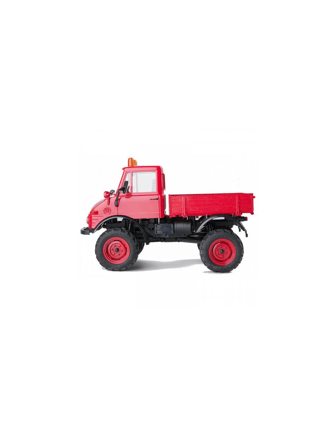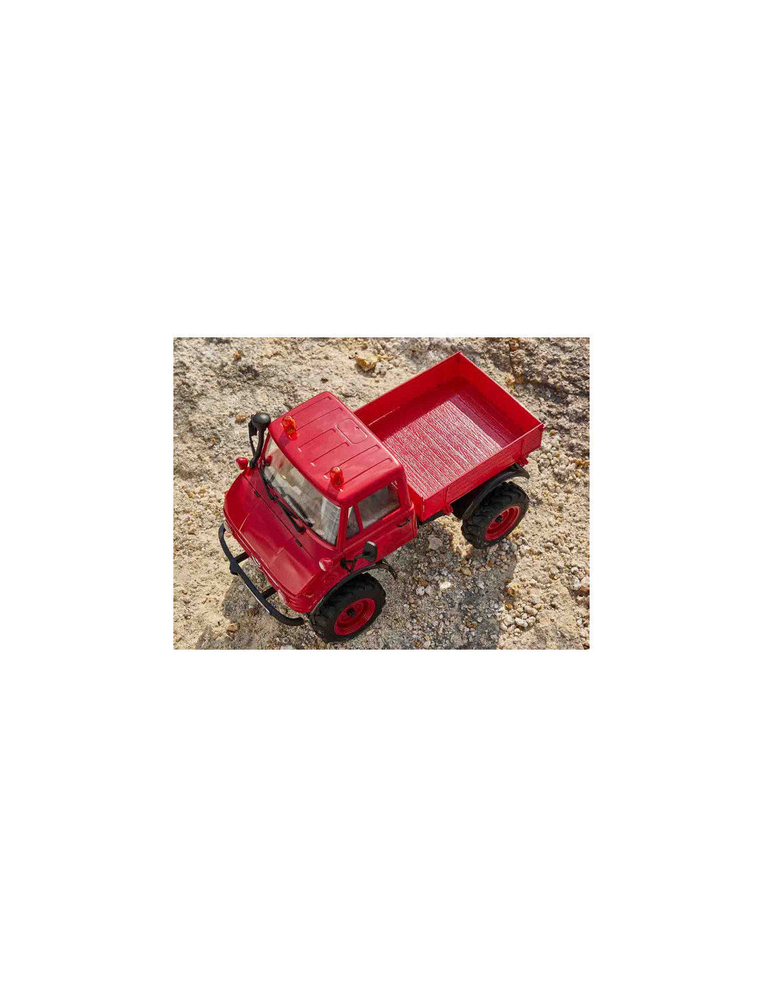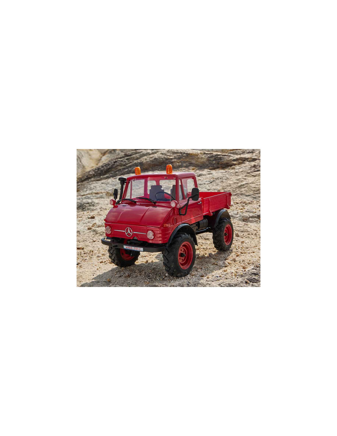 El Unimog utiliza el chasis de alto rendimiento de la serie FCX24 (con piezas realistas adicionales como el depósito de combustible y el acumulador de presión). El chasis del vehículo está fabricado de nailon de alta resistencia. En comparación con vigas trapezoidales unidas mediante soportes laterales metálicos y espaciadores de plástico. , el peso total es menor y la resistencia mayor. La unidad motriz montada en el centro tiene un centro de gravedad bajo y combina la caja de cambios de dos velocidades, la caja de transferencia y el motor. La potencia se transmite a los ejes delantero y trasero a través del eje de toma de fuerza. Los ejes pórtico aumentan la distancia al suelo del anillo del diferencial.