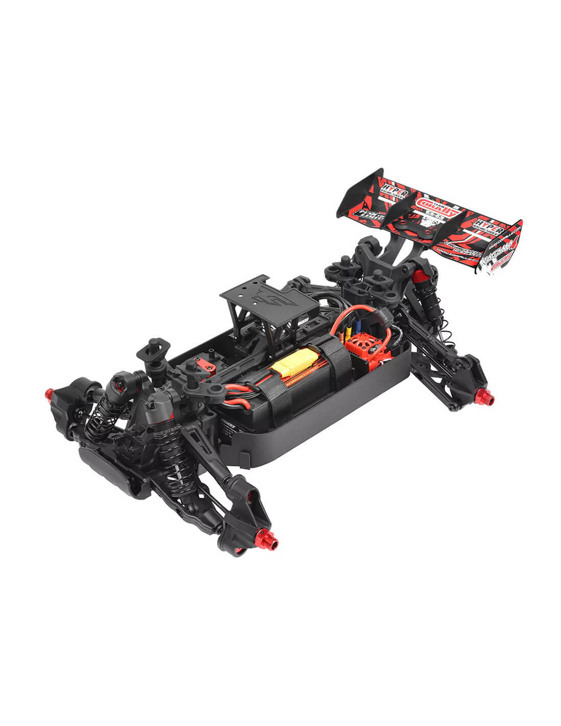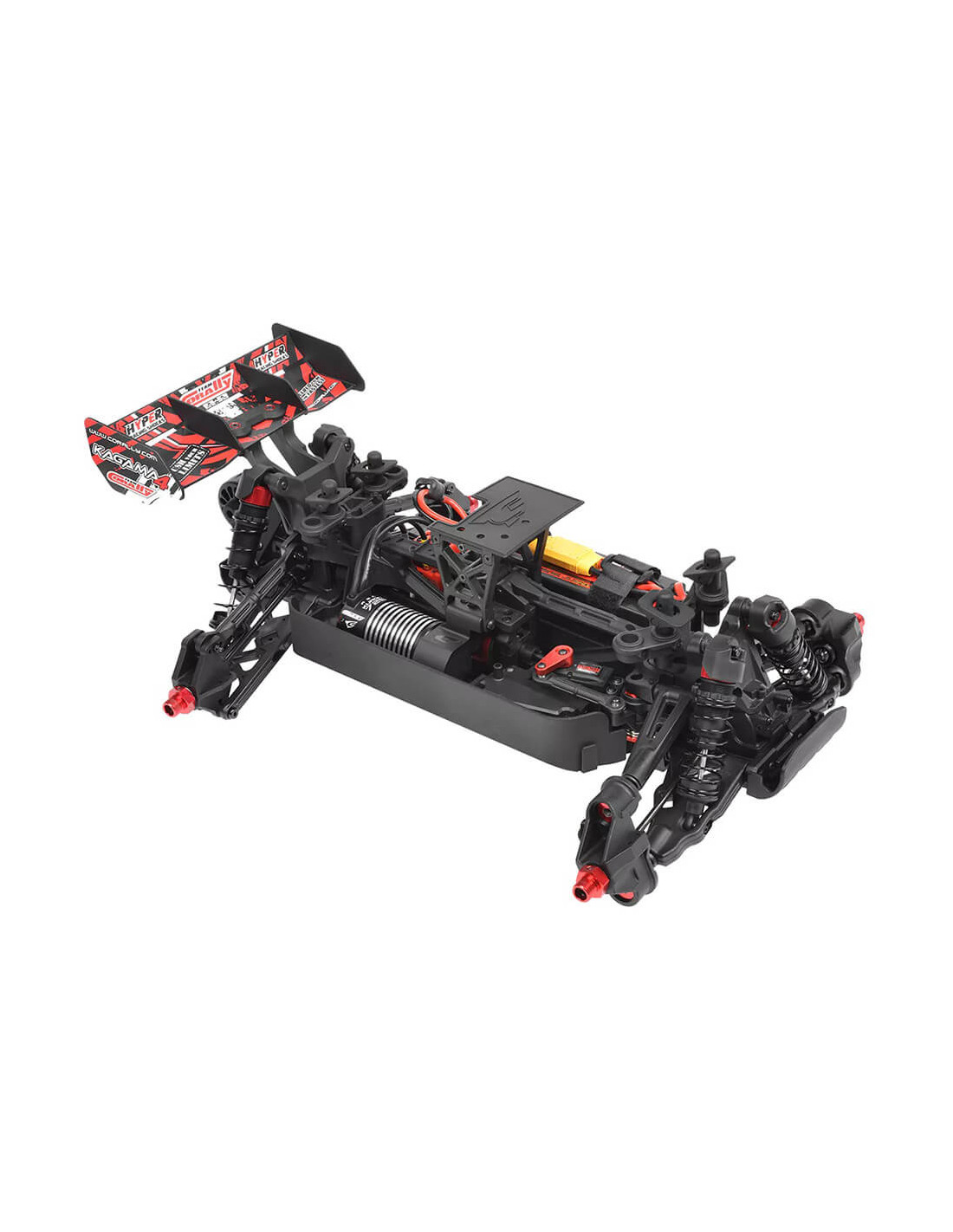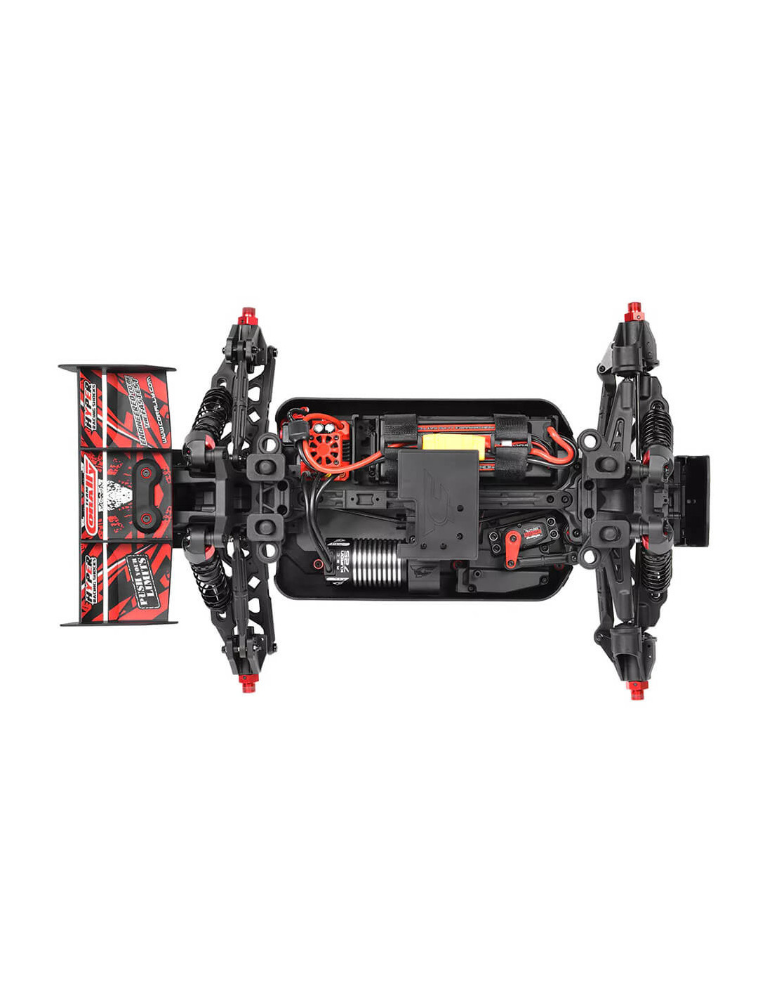 Su soporte de motor de aluminio híbrido ofrece tres posiciones de motor para una alineación precisa del piñón. La transmisión reforzada, que cuenta con copas de acero en la transmisión y un robusto engranaje recto de 52T, garantiza una durabilidad duradera. Los bujes anchos de las ruedas Kagama y Sketer añaden estabilidad y capacidad todoterreno, mientras que una nueva barra anti-caballitos ayuda a gestionar la inmensa potencia. Desde el motor sin escobillas Kuron 725 hasta el ESC Torox 135, cada componente contribuye a una emocionante velocidad máxima de más de 80 km/h. El transmisor CT2S de 2,4 GHz, el sistema de refuerzo del chasis y el alerón de alta carga aerodinámica completan el paquete, convirtiendo al Kagama4 en un verdadero testimonio del legado de innovación y rendimiento del Team Corally.