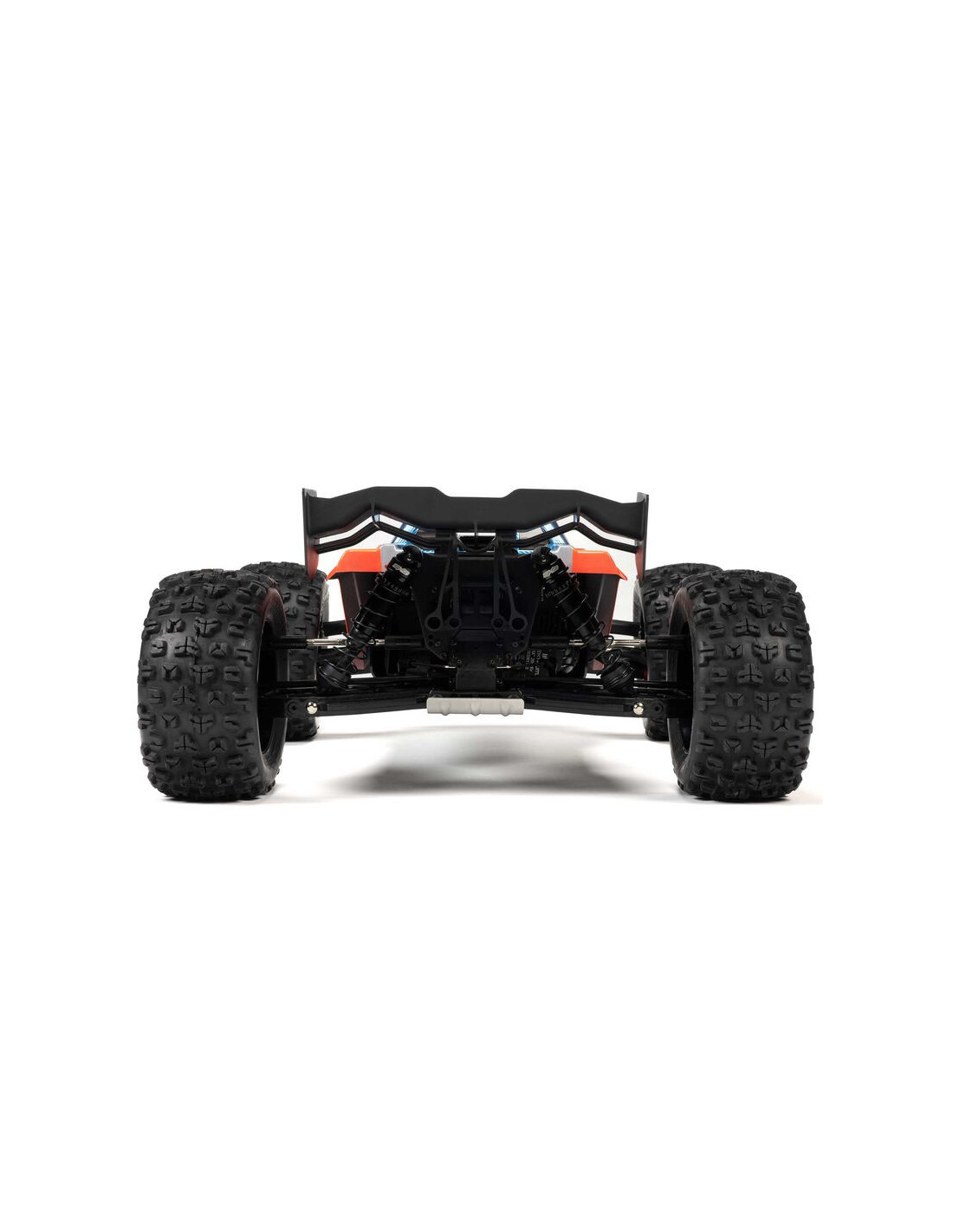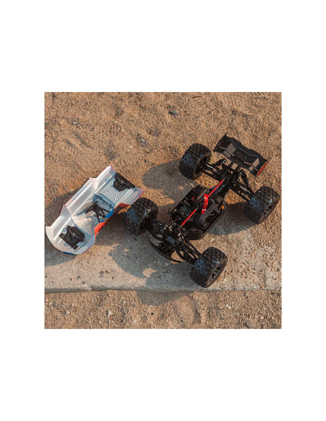 La carrocería aerodinámica del Monster Truck KRATON está disponible en dos llamativos acabados de fábrica multicolor. Su sistema de retención de carrocería sin clip y de liberación rápida también funciona como protección contra perforaciones en la carrocería. El soporte para su alerón de alta carga aerodinámica ahora tiene durabilidad EXB (Extreme Bash) para resistir roturas.