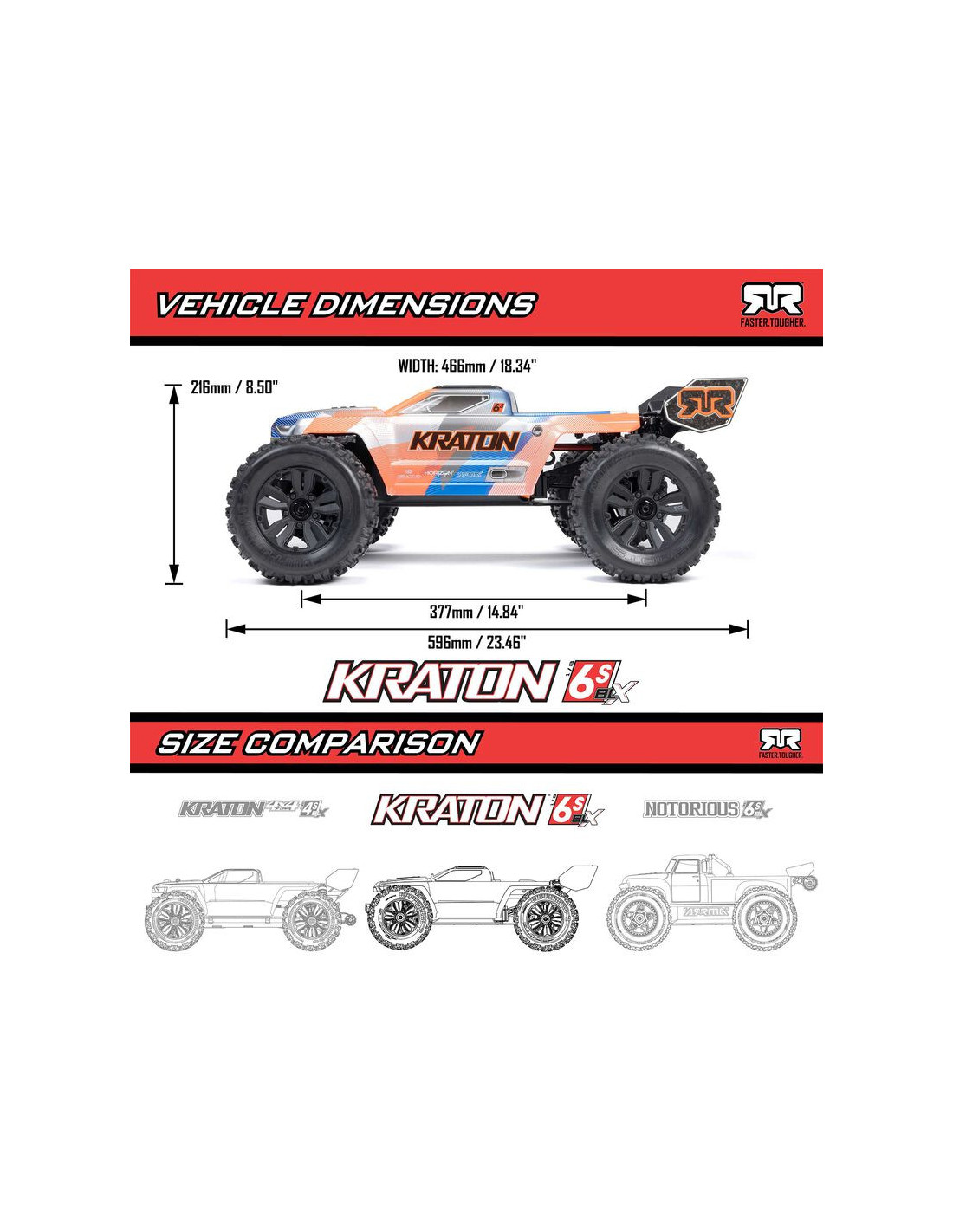 Este KRATON 6S BLX 4X4 actualizado a escala 1/8 tiene la potencia para alcanzar velocidades de más de 65 mph y la resistencia para seguir adelante después de dar grandes saltos. También es rápido y divertido en 4S si aún no estás listo para los extremos del 6S* y viene equipado para dar ese salto cuando lo estés.