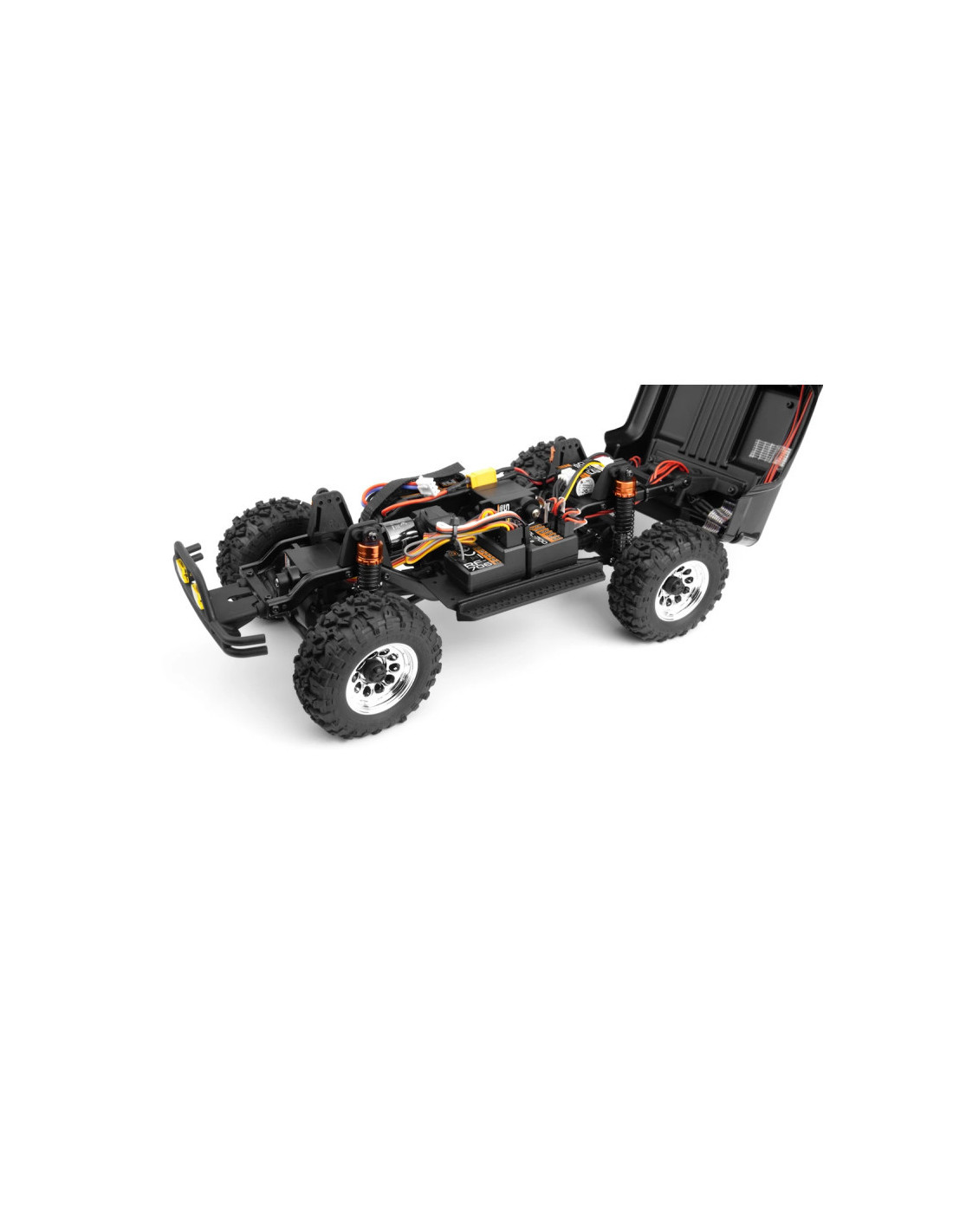 La configuración de la suspensión del Venture18 le ayuda a conducir estupendamente tanto en carretera como fuera de ella, ¡y tiene el mismo aspecto que el auténtico mientras conduce! ¡Aquí no hay rebotes ni muelles irreales! Gracias a su suspensión a escala tomada de máquinas todoterreno reales, además de la perfecta colocación de componentes como el servo de dirección, la transmisión y la electrónica, ¡podrá llevar su adVenture prácticamente a cualquier parte!