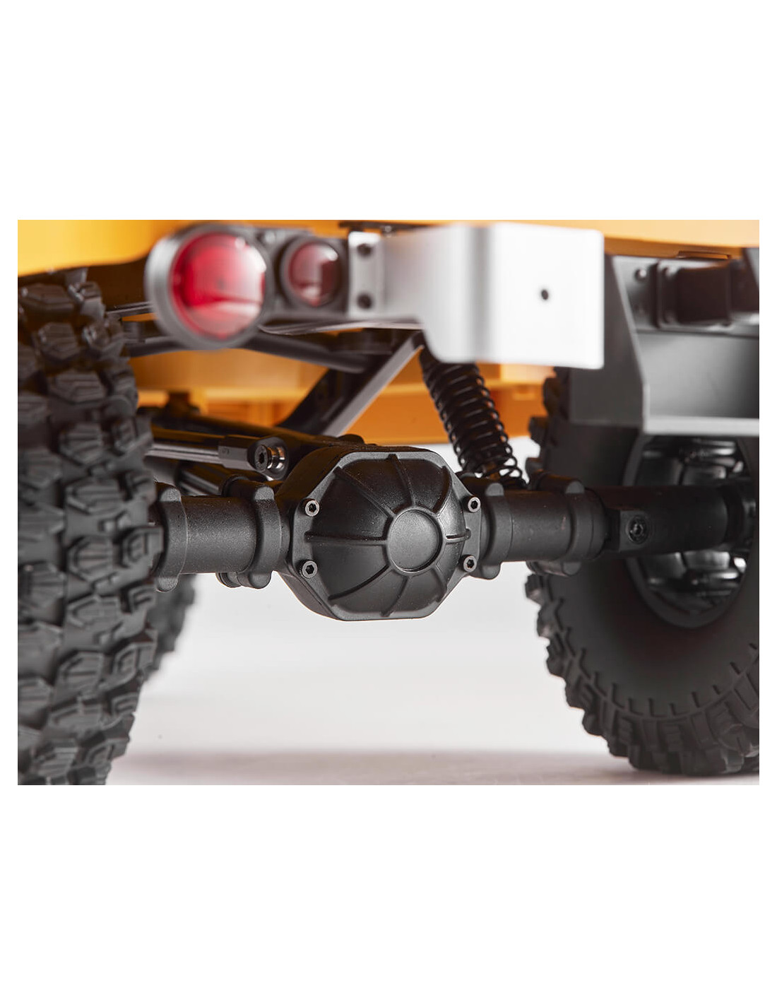 Los neumáticos de escalada de 1.9" ofrecen un buen agarre en todo tipo de terrenos. El sistema de suspensión de cuatro brazos garantiza un mayor recorrido de los amortiguadores y una mejor maniobrabilidad. Las vigas trapezoidales metálicas proporcionan una sólida estructura de soporte. Incluso con la carrocería rígida de ABS y el interior completo, el vehículo supera fácilmente las condiciones extremas de la carretera. El FJ40 real utiliza suspensión de ballesta. Para quienes buscan una simulación extrema, el chasis puede instalarse con suspensión de ballesta (se vende por separado) para recrear el estilo del vehículo real. Lograr el rendimiento en escalada y la restauración parece imposible, pero gracias al diseño compatible del chasis y la sustitución de algunos accesorios, puede adoptar una forma completamente diferente.