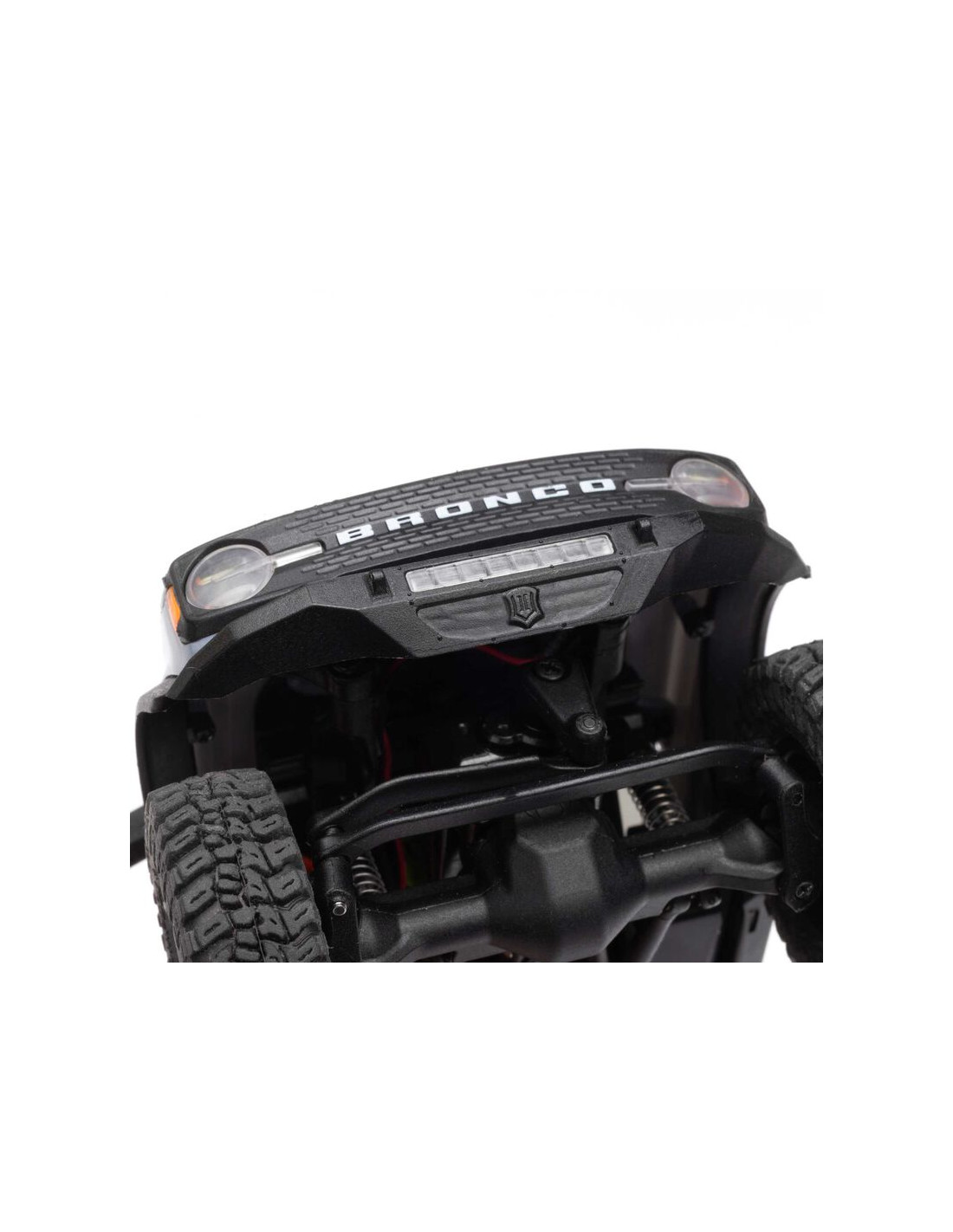 Por ejemplo, el Ford Bronco SCX30 incluye una placa de deslizamiento angular que facilita el deslizamiento sobre obstáculos difíciles. Esta característica solo se encuentra en los crawlers de competición. Las carcasas de eje inclinadas y las bieletas de gran altura libre también ayudan a evitar el arrastre y los atascos. El rendimiento en terreno rocoso se ve reforzado por la estabilidad en ascenso gracias a la distribución del peso hacia adelante del chasis. Y hay mucho más, desde amortiguadores con amortiguación, rodamientos de bolas completos y un potente motor Axial 88T hasta la fiable electrónica Spektrum, montada en la parte baja del chasis para un centro de gravedad óptimo.