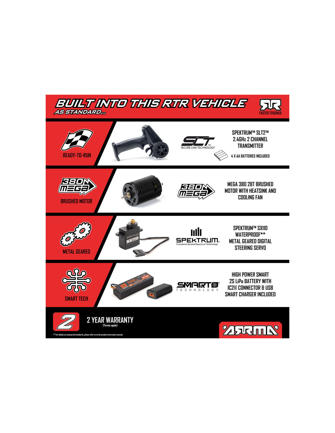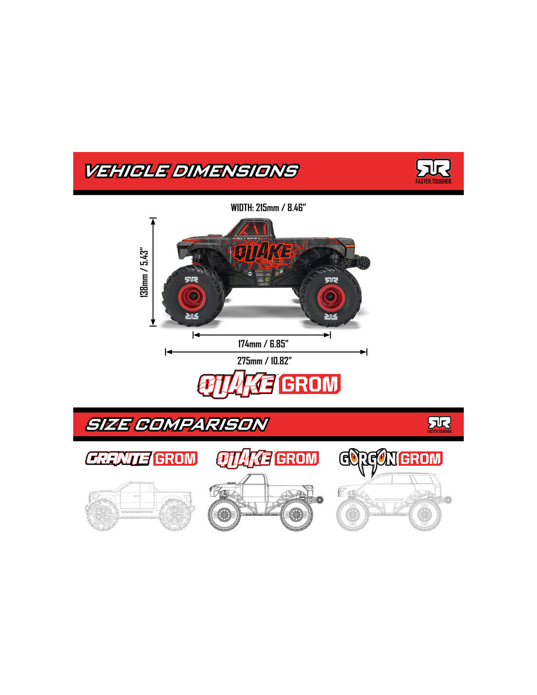 El Monster Truck QUAKE GROM 4X4 RTR está diseñado y fabricado con los mismos altos estándares de durabilidad y rendimiento que esperas de cualquier vehículo ARRMA. ¡Solo que es más pequeño!