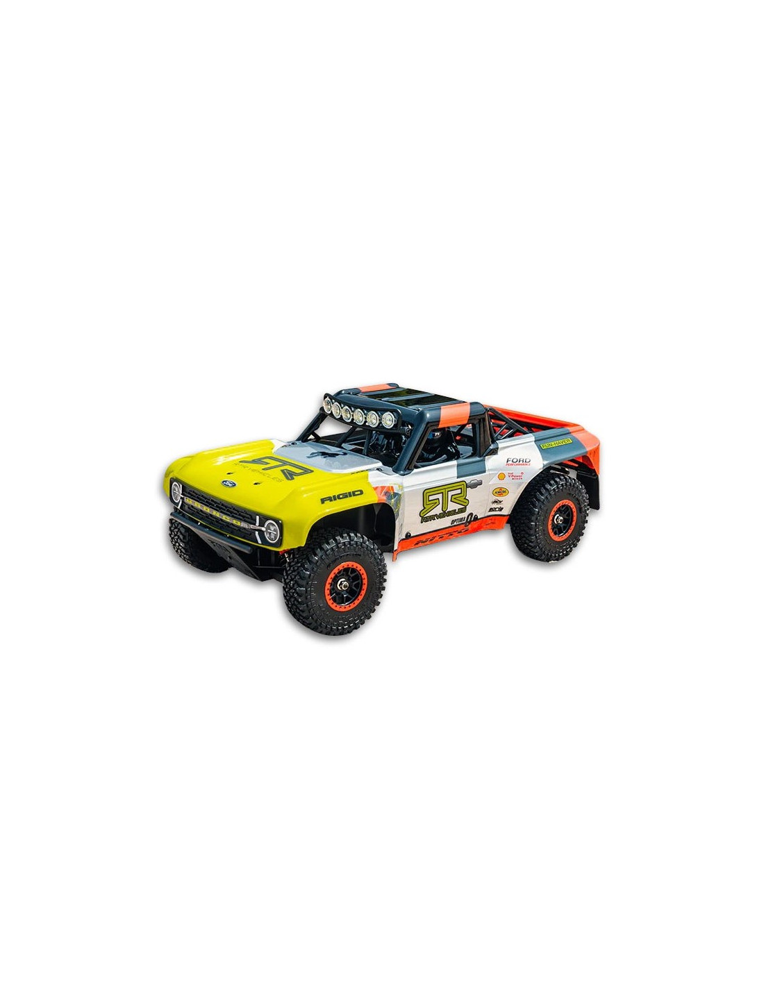 Con licencia oficial de Ford y RTR Vehicles, este modelo reproduce fielmente el aspecto y la sensación del Bronco de competición Ultra4. Desde sus líneas de carrocería precisas y los detalles de iluminación hasta las calcomanías de marcas como Nitto, Shell, Fox y Pennzoil, cada elemento ofrece un realismo digno de un coche de carreras. Una cabina detallada con figura de piloto completa la experiencia a escala.