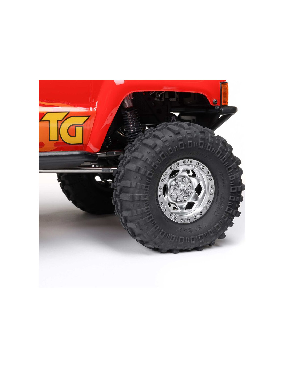 Las llantas Beadlock Trail-Gear Creeper Lock, con licencia oficial, completan el aspecto realista y el rendimiento de esta camioneta. Los neumáticos Interco Super Swamper proporcionan el agarre y la altura libre al suelo necesarios para conquistar cualquier terreno.