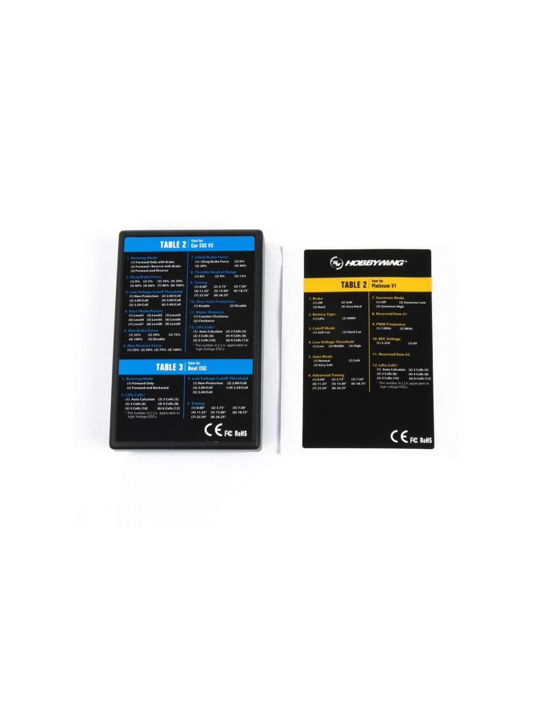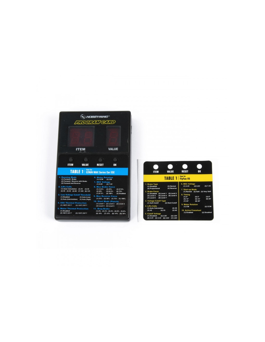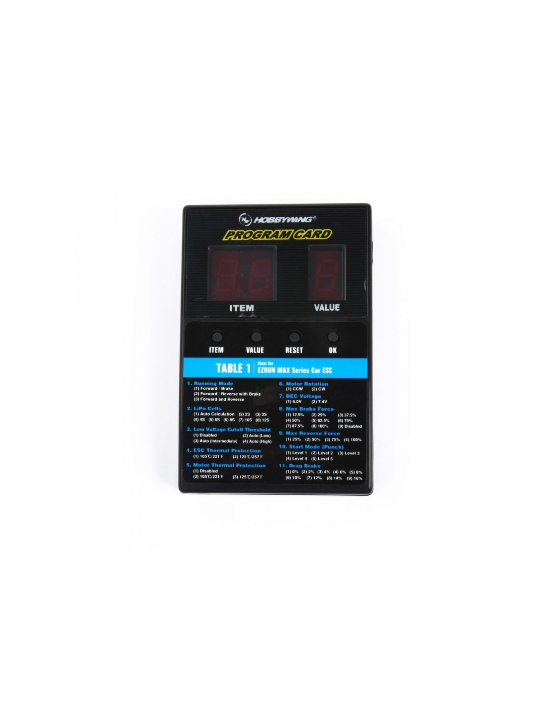 Este cuadro de programa de LED es para la programación de ESC sin escobillas HobbyWing. Su interfaz amigable hace que la programación de ESC sea fácil y rápida. Es compacto, portátil y muy aplicable para uso en campo.