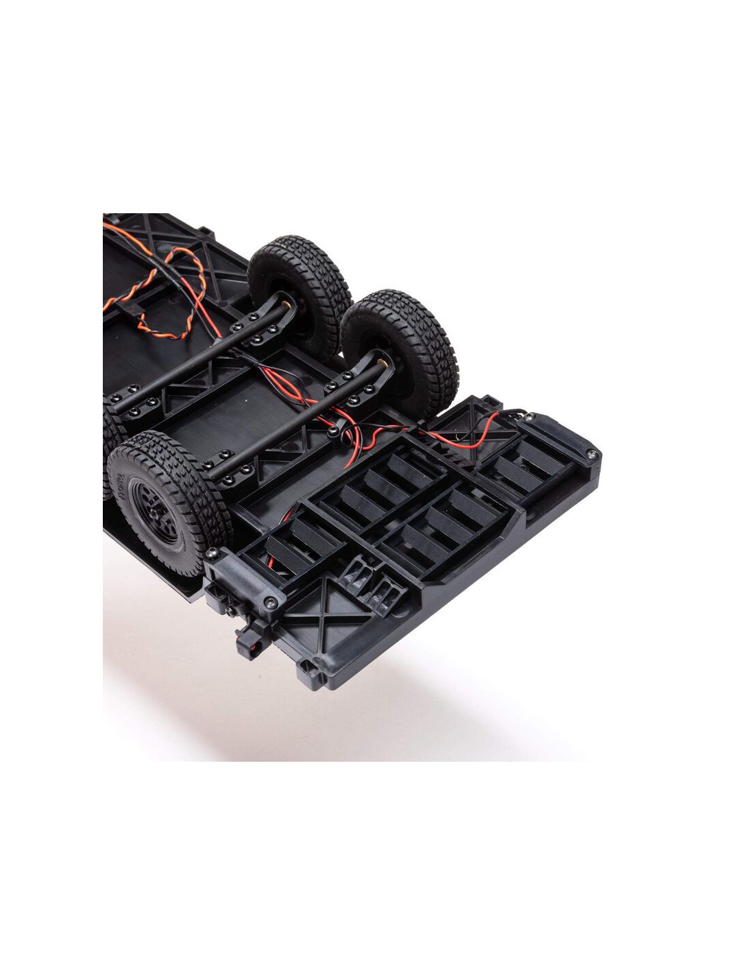 El remolque SCX24 es una pieza de exhibición llamativa cuando no lo estás usando para remolcar tus equipos. El remolque de doble eje está hecho de compuesto negro moldeado por inyección con una placa de diamante y un acabado texturizado de madera. Hay paneles simulados de "madera pintada" en el centro del remolque. Las luces LED rojas precableadas continúan el realismo en el sendero, en interiores o exteriores, de día o de noche, agregando la apariencia auténtica que los entusiastas de los vehículos RC esperan de Axial.
