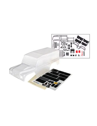 Carrocería, Land Rover Defender, completa (transparente, recortada, requiere pintura) (incluye parrilla, espejos laterales, manijas de las puertas, limpiaparabrisas, ExoCage, soporte para llanta de repuesto, calcomanías, máscaras de ventanas